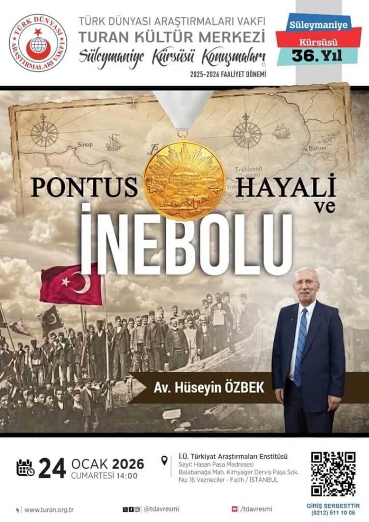 Turan Kültür Merkezi Süleymaniye Kürsüsü etkinliklerimize, 24 Ocak 2026 Cumartesi günü 14.00’te, İstanbul Üniversitesi Türkiyat Araştırmaları Enstitüsü Konferans salonunda, Av. Hüseyin Özbek’in konuşmacı olduğu “Pontus Hayali ve İnebolu” konulu konferansımızla devam ediyoruz.