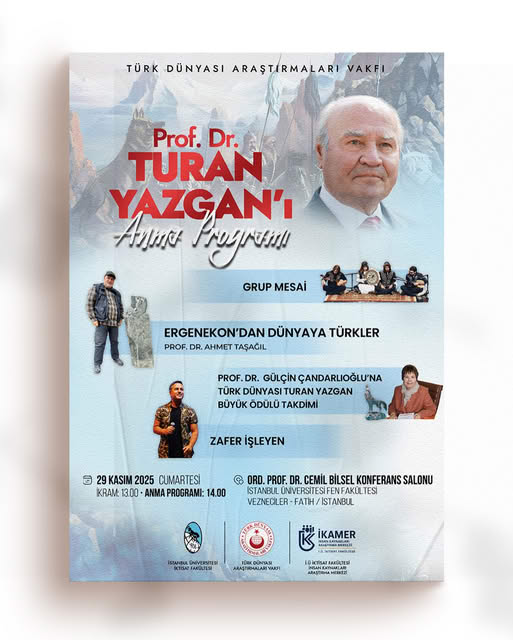 Son yüzyılın büyük Türkçüsü, bütün ömrünü Türk Dünyası’nın “Dilde, Fikirde, İşte Birlik” ülküsünü gerçekleştirmeye adayan, Vakfımızın Kurucu Başkanı Prof. Dr. Turan Yazgan Hocamızı sonsuzluğa yürüyüşünün 13. yılında gerçekleştireceğimiz anma programı ve Türk Dünyası Turan Yazgan Büyük Ödülü Takdim törenine davetlisiniz.