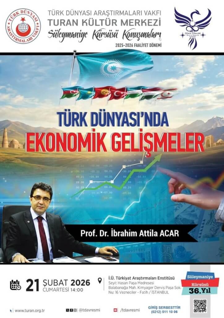 Turan Kültür Merkezi Süleymaniye Kürsüsü etkinliklerimize, 21 Şubat 2026 Cumartesi günü 14.00’te, İstanbul Üniversitesi Türkiyat Araştırmaları Enstitüsü konferans salonunda, Dünya Türkleri Bilim ve Teknoloji Akademisi Derneği iş birliğiyle gerçekleştireceğimiz ve Prof. Dr. İbrahim Attila Acar’ın konuşmacı olduğu“Türk Dünyası’nda Ekonomik Gelişmeler” konulu konferansımızla devam ediyoruz.