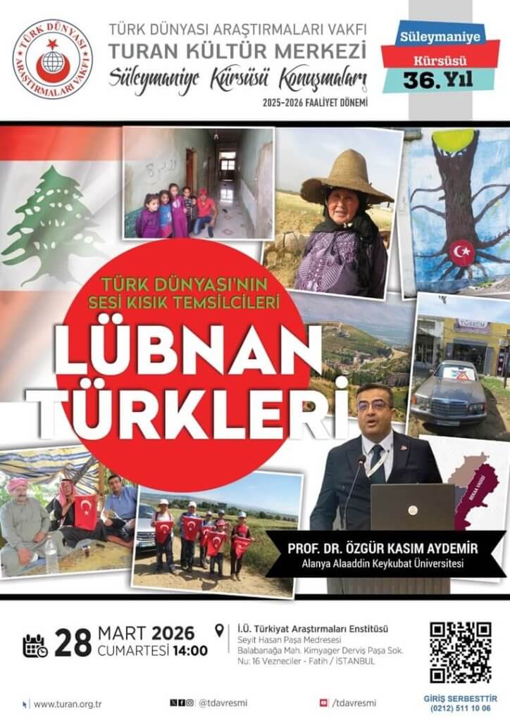 Turan Kültür Merkezi Süleymaniye Kürsüsü etkinliklerimize, 28 Mart 2026 Cumartesi günü 14.00’te, İstanbul Üniversitesi Türkiyat Araştırmaları Enstitüsü konferans salonunda Alanya Alaaddin Keykubat Üniversitesi Öğretim Üyesi Prof. Dr. Özgür Kasım Aydemir’in vereceği “Türk Dünyası’nın Sesi Kısık Temsilcileri Lübnan Türkleri” konulu konferansımızla devam ediyoruz.