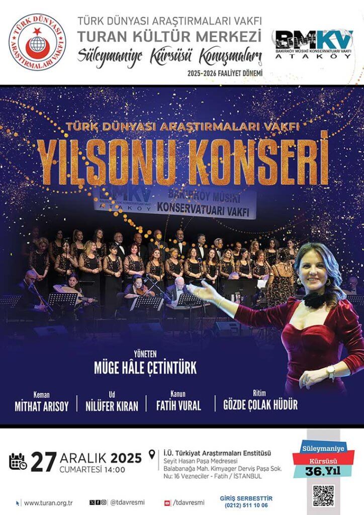Turan Kültür Merkezi Süleymaniye Kürsüsü etkinliklerimize, 27 Aralık 2025 Cumartesi günü 14.00’te, İstanbul Üniversitesi Türkiyat Araştırmaları Enstitüsü Konferans salonunda, Mithat Arısoy (Keman), Nilüfer Kıran (Ud), Fatih Vural (Kanun), Gözde Çolak Hüdür (Ritim)’ün sazları eşliğindeki Müge Hâle Çetintürk yöneteceği Bakırköy Musiki Konservatuvarı Vakfı Korosu’nun vereceği Yıl Sonu Konseri’yle devam ediyoruz.
